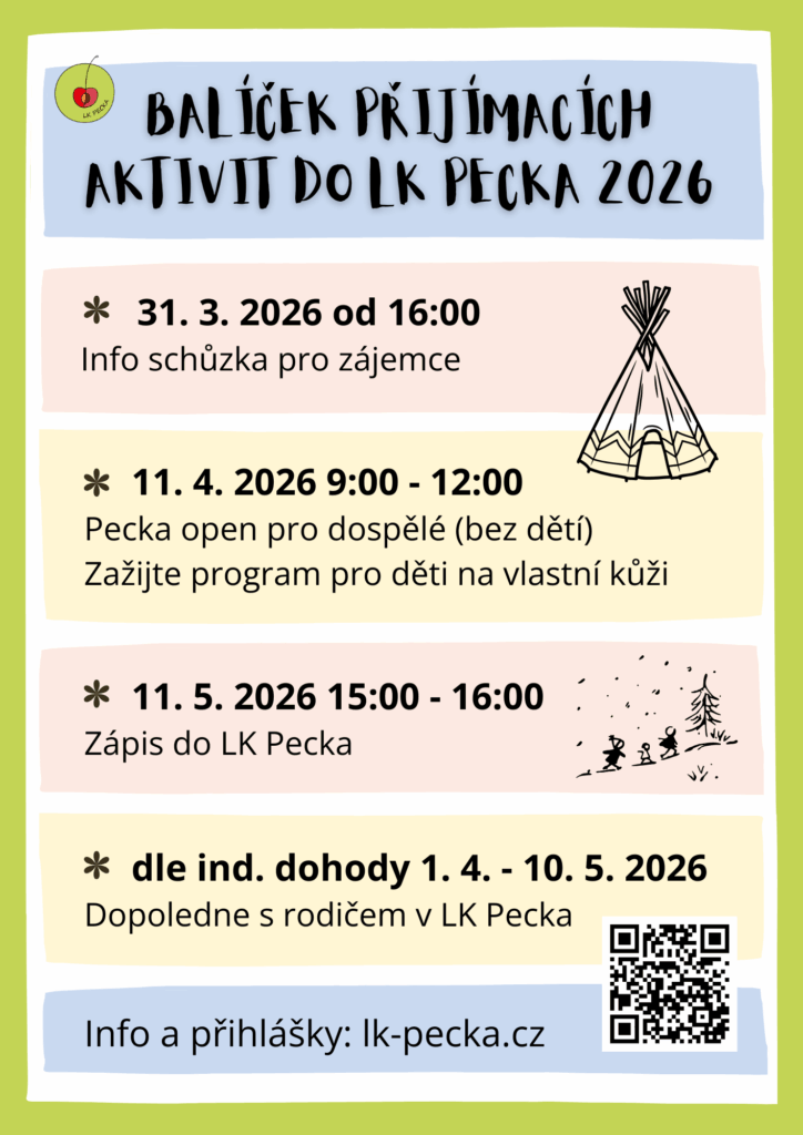 SYSTÉM DOCHÁZKY NA ROK 2026/2027 se mění – docházka je buď všech 5 dní, nebo pevně dané 3 dny pondělí-středa, nebo 2 dny čtvrtek-pátek. V ROCE 2026/2027 BUDEME NABÍZET NOVÝM DĚTEM DOCHÁZKU NA 2 DNY (ČT-PÁ). Další dny jsou bohužel obsazeny dětmi, které do Pecky již chodí. Jelikož ale v tomto školním roce bude v Pecce hodně předškoláků, budeme v dalším roce 2027/2028 nabírat větší množství nových dětí a to i na pětidenní docházku.