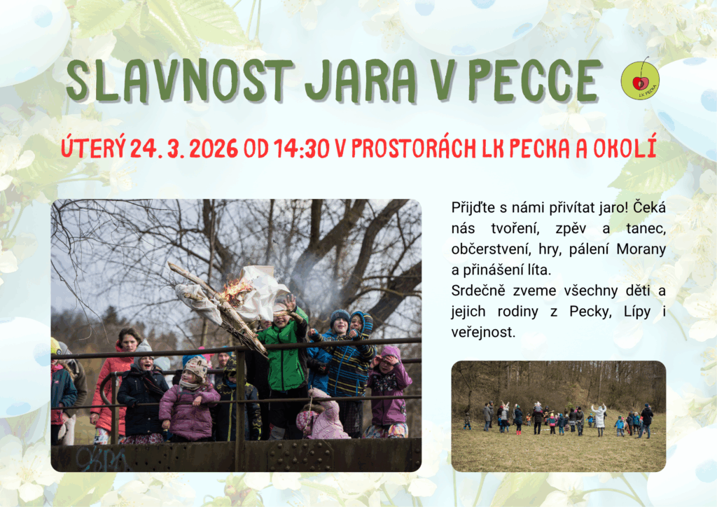V úterý 24. 3. 2026 pořádáme Slavnost jara. Čeká nás zpěv, tanec, tvoření, pálení Morany a hodování! Srdečně zveme i veřejnost.